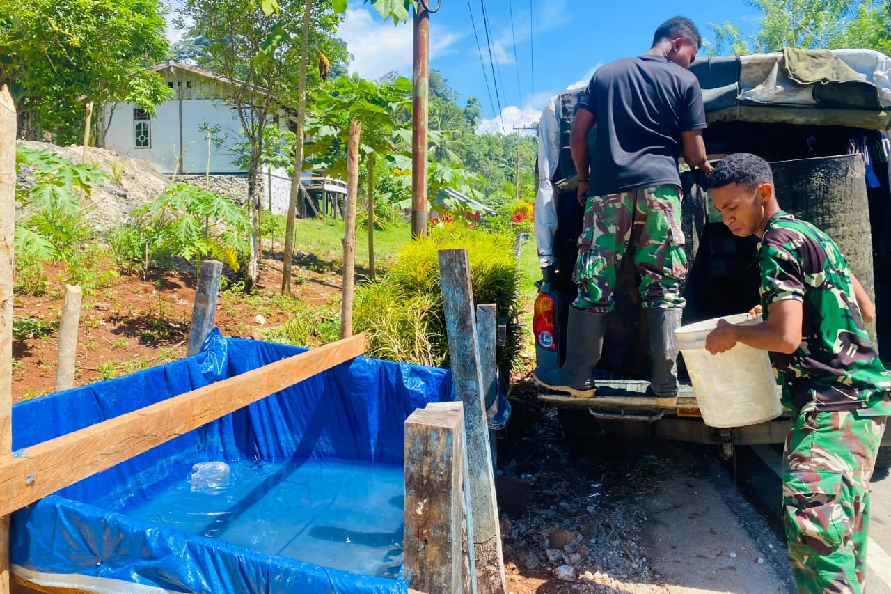 Setibanya di lokasi, air langsung dituangkan ke dalam bak penampungan yang sebelumnya telah dibuat oleh personel satgas. Bak ini menjadi solusi sementara agar pekerjaan tetap berjalan.